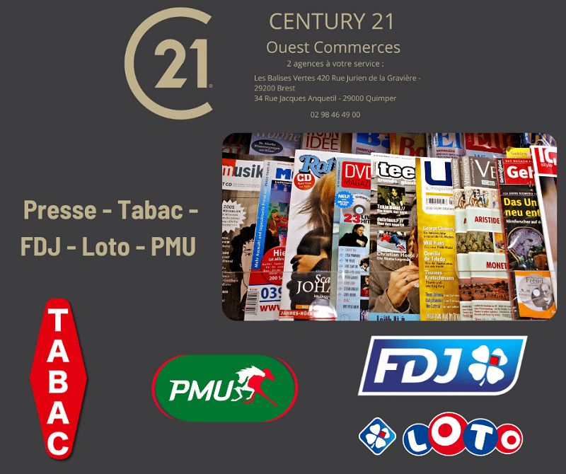 Bretagne Finistére situé sur un site touristique majeur de Bretagne situé sur un site touristique de premier ordre un Bar tabac PMU FDJ snack et crepes à Vendre Affaire d’angle Cette affaire de par sa surface pourra accueillir des activités connexes comme pizzeria, restauration,organisation de soirées privées grâce à ses 500 m2 de superficie sur un seul niveau Capacité d’accueil de 80 couverts en intérieur et 50 places en terrasse avec vue imprenable Cette affaire est une affaire coup de coeur et grand confort de travail Ce commerce comprend un appartement au dessus du commerce disposant d’une grande pièce de vie lumineuse avec jolie vue et 4 chambres spacieuses, bref un grand confort dev ie pour vous et votre famille Possibilité Achat des murs. Affaire fermée un jour par semaine et semaines de congés (fermeture du commerce). CA bar, snack (ventes marchandises) de 357 000 EURuros Hors Taxes au dernier Bilan Commissions de 67000 EURuros dont 46000 EURuros de commissions Tabac. Ebe reconstitué pour couple d’exploitants de 156 000 EURuros Prix de vente trés competitif de 356 800 EURuros Frais d’Agence Inclus pour le fonds de commerce Honoraires de 26500 EURuros Hors Taxes (soit 31800 EURuros Toutes Taxes Comprises). Prix net vendeur de 320 000 EURuros Référence 7760 Century 21 Ouest commerces 2 agences spécialisées en immobilier professionnel à votre service à Quimper et à Brest Nos métiers Vente de fonds de commerce-Cession dentreprise-Gestion locative-Vente de murs commerciaux-Immobilier dentreprise et immobilier commercial.